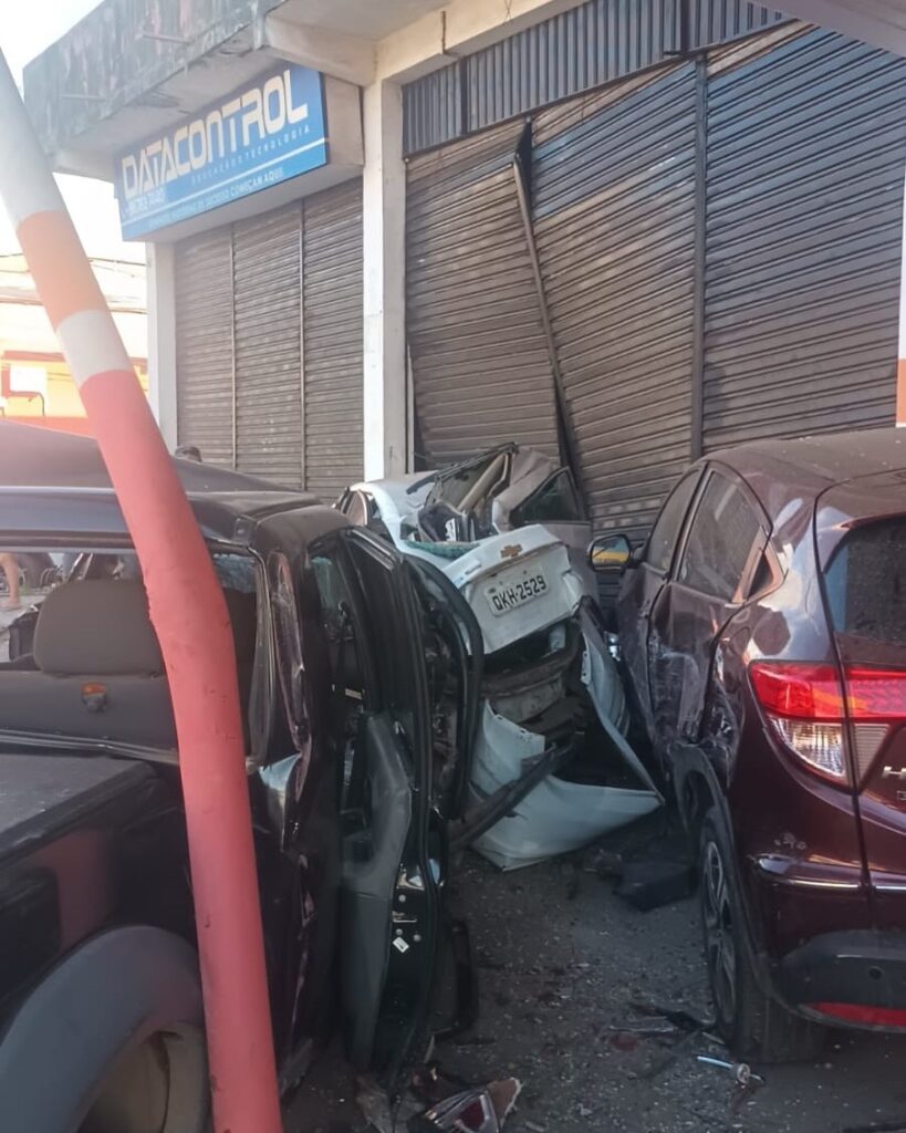 Segundo testemunhas, o coletivo — que saía da garagem para iniciar a rota e estava sem passageiros — colidiu com a caminhonete em um cruzamento. Com o impacto, os veículos foram projetados para frente e acabaram atingindo outros dois carros e danificando um estabelecimento comercial.