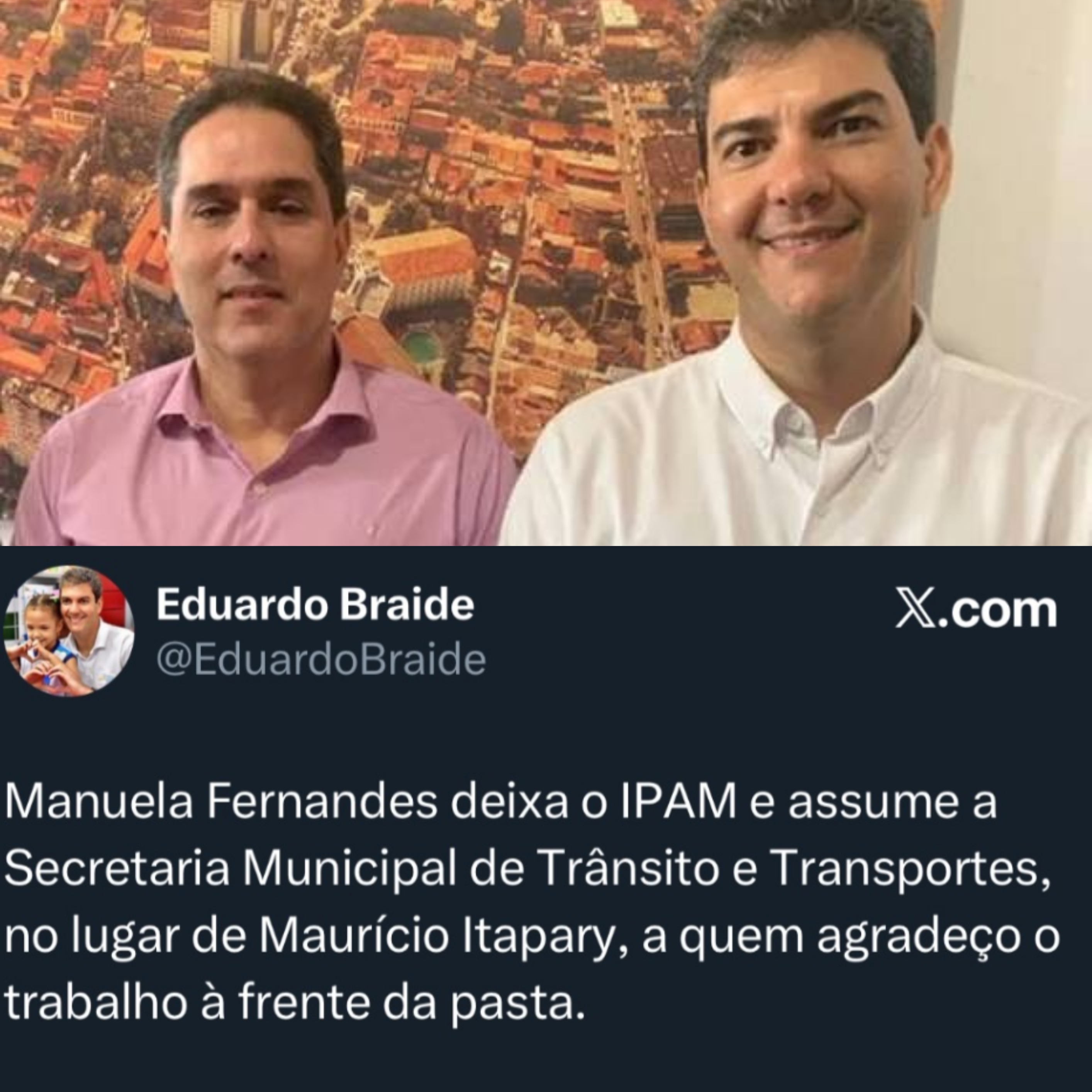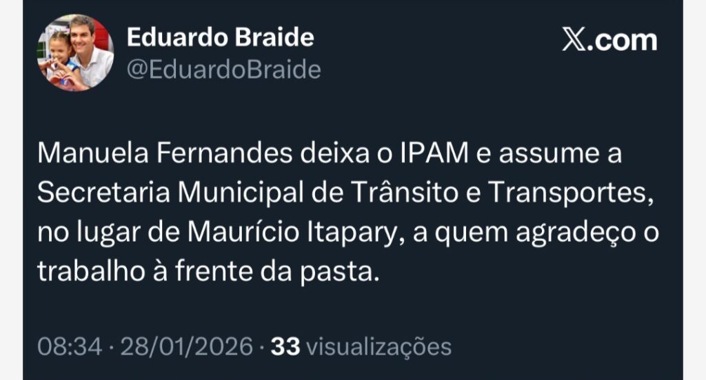 Para o lugar de Itapary, Braide nomeou Manuela Fernandes, que deixa a presidência do IPAM e assume a SMTT com a missão de tentar conter a crise que se arrasta há meses. A mudança no comando acontece em um momento de tensão entre rodoviários, empresários do setor e a Prefeitura de São Luís.