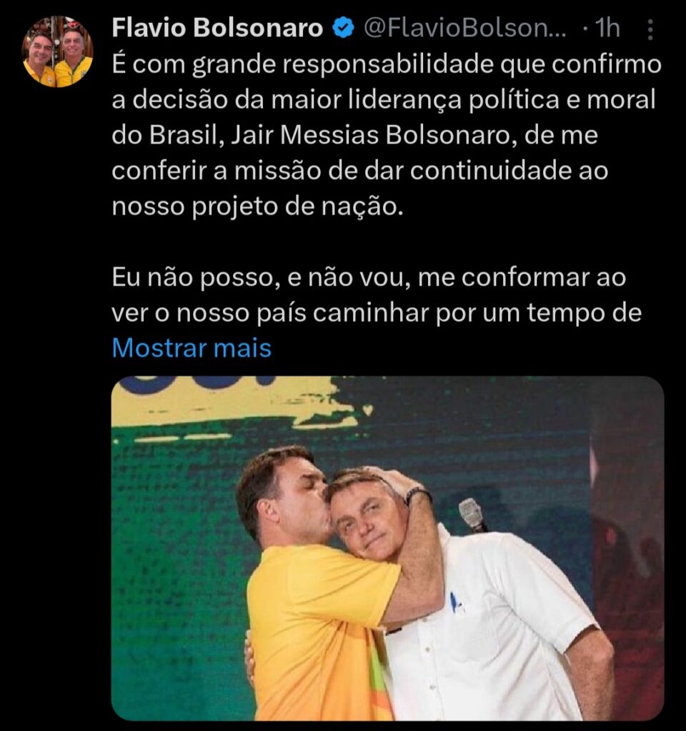 No comunicado, Flávio afirmou que recebeu a “missão de dar continuidade” ao projeto político da família Bolsonaro. O senador adotou tom dramático ao dizer que o país vive um período de “instabilidade, insegurança e desânimo” e que a democracia estaria “sucumbindo”. Ele também recorreu à religiosidade para reforçar sua posição: “Eu me coloco diante de Deus e diante do Brasil para cumprir essa missão. Sei que Ele irá à frente, abrindo portas e guiando cada passo dessa jornada”.