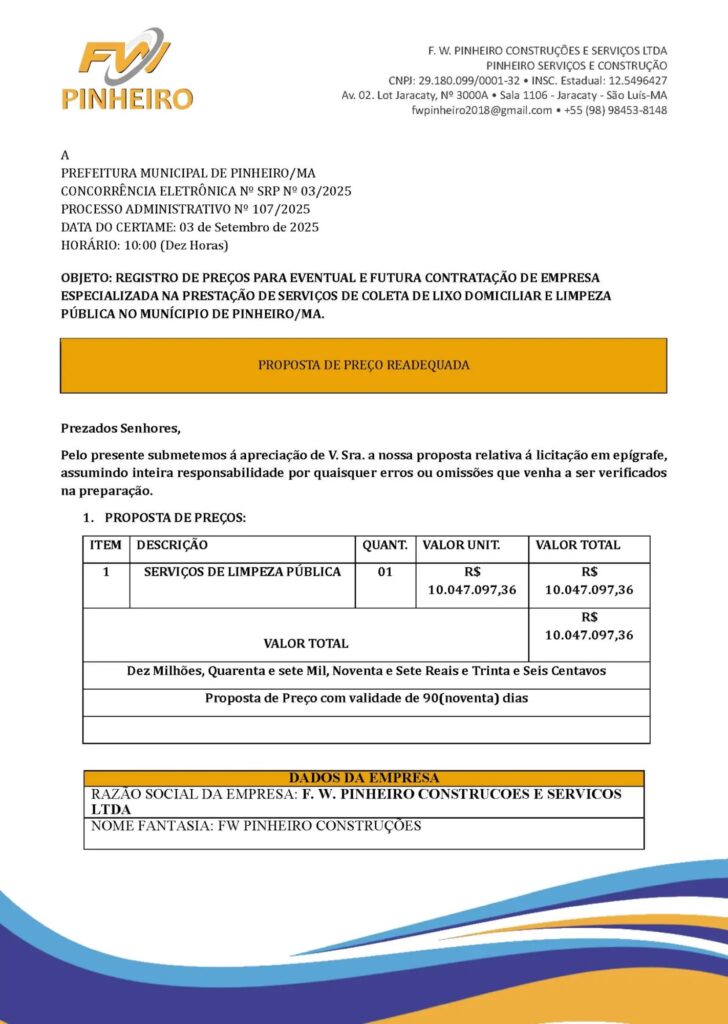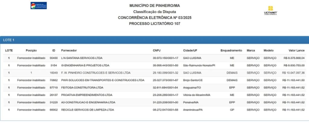 Sem concorrência, a F. W. Pinheiro ficou com a dianteira, oferecendo R$ 10,04 milhões — valor R$ 1,67 milhão superior ao da proposta mais baixa. O contrato ainda não foi assinado, mas, como única habilitada, a empresa deve ser oficialmente contratada.