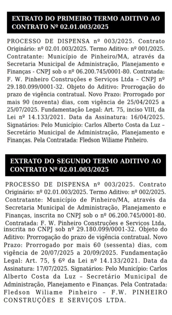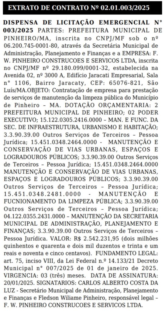 O caso teve início em 20 de janeiro de 2025, quando a empresa recebeu um contrato emergencial de R$ 2,54 milhões para serviços de limpeza, com duração prevista de 90 dias. O acordo, porém, foi prorrogado por quase oito meses por meio de dois aditivos, sem explicações claras da prefeitura sobre a necessidade de manter a dispensa de licitação por tanto tempo.
