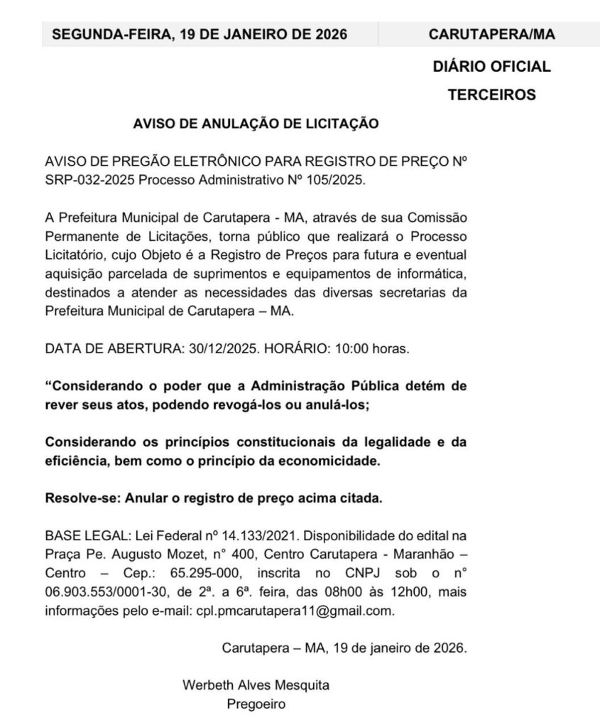 A Prefeitura de Carutapera, no litoral norte do Maranhão, anulou uma licitação estimada em R$ 5 milhões voltada à aquisição de equipamentos, serviços e suprimentos de tecnologia da informação, após denúncia publicada pelo portal São Luís Notícia apontar possíveis irregularidades no processo licitatório.