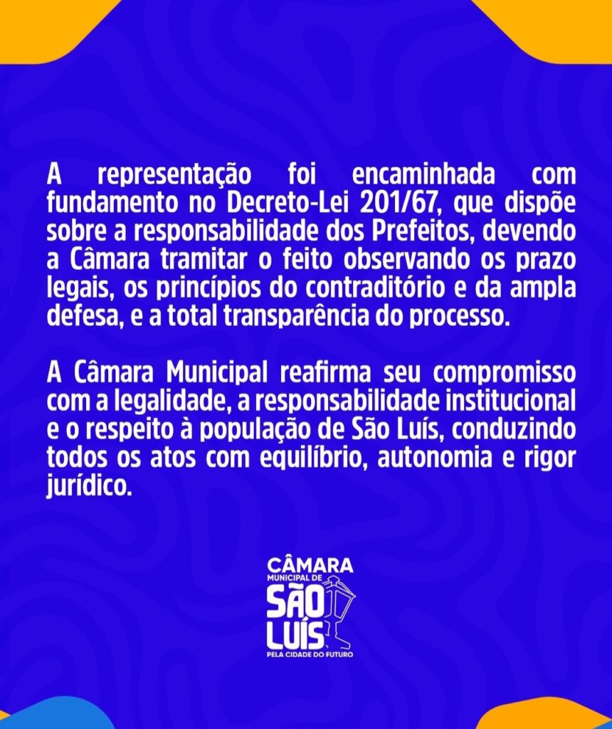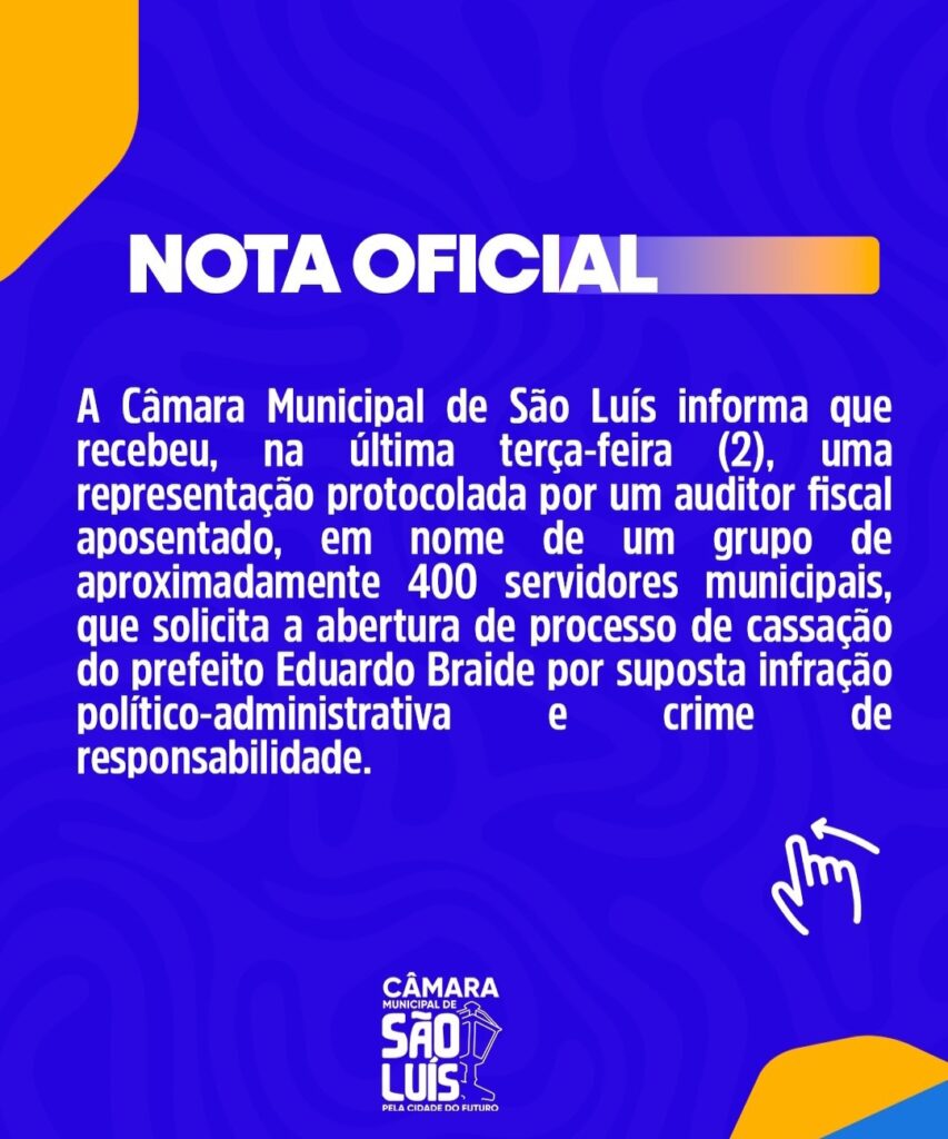 A Câmara Municipal de São Luís divulgou, nesta sexta-feira (5), uma nota oficial confirmando o recebimento de uma representação que pede a abertura de processo de afastamento do prefeito Eduardo Braide.