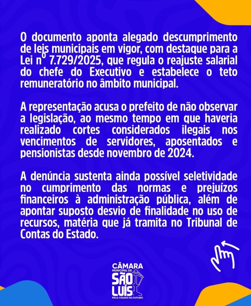 O documento foi protocolado na terça-feira (2) por um auditor fiscal aposentado, que afirma representar cerca de 400 servidores municipais e aponta supostas infrações político-administrativas relacionadas ao descumprimento de leis municipais, cortes considerados ilegais nos vencimentos de servidores e possíveis irregularidades já analisadas pelo TCE-MA.