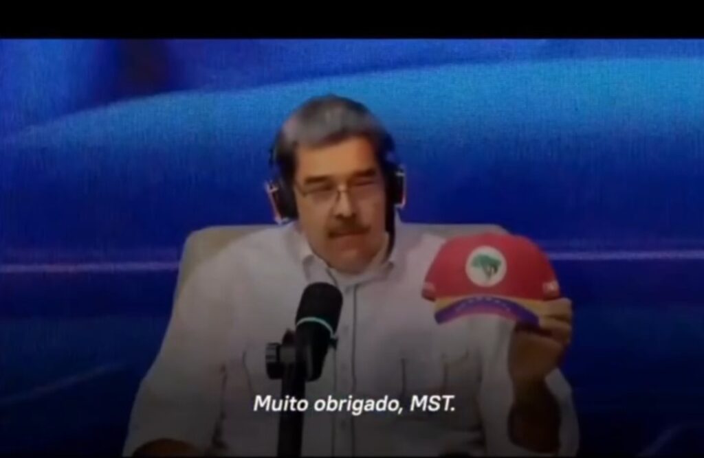A declaração ocorreu durante um programa de TV venezuelano, no qual Maduro apareceu segurando um boné do Movimento dos Trabalhadores Rurais Sem Terra (MST). Em “portunhol”, ele agradeceu o presente e convocou o povo brasileiro a demonstrar solidariedade.