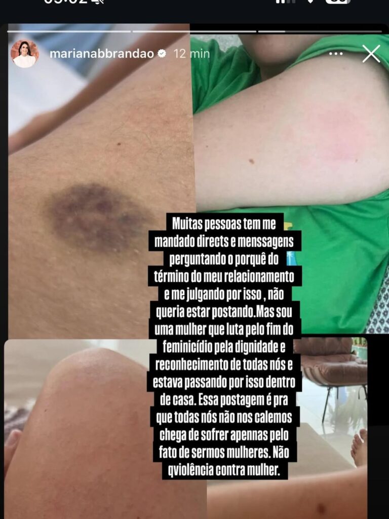 Nas imagens, que ficaram no ar por poucos minutos antes de serem excluídas, Mariana exibia hematomas e marcas no corpo, alegando que eram resultado de agressões sofridas dentro de casa. No texto que acompanhava as fotos, ela justificou a exposição pública após receber inúmeras mensagens e cobranças sobre o fim do casamento.